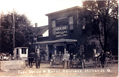 The Pennsylvania Railroad intersected Main Street in the middle of Hilliard. The railroad connected us to the rest of the world. The mail train would hook the mail bag onto the mail arm as the train sped past. The mail was then delivered to the Post Office, which was located in Winterringer's General Store. There were two very important trains that stopped every day. The 8 o'clock morning train took people to work or to shop in Columbus. Those people then returned to Hilliard on the 5:20 evening train. That train brought newspapers and freight as well as passengers.